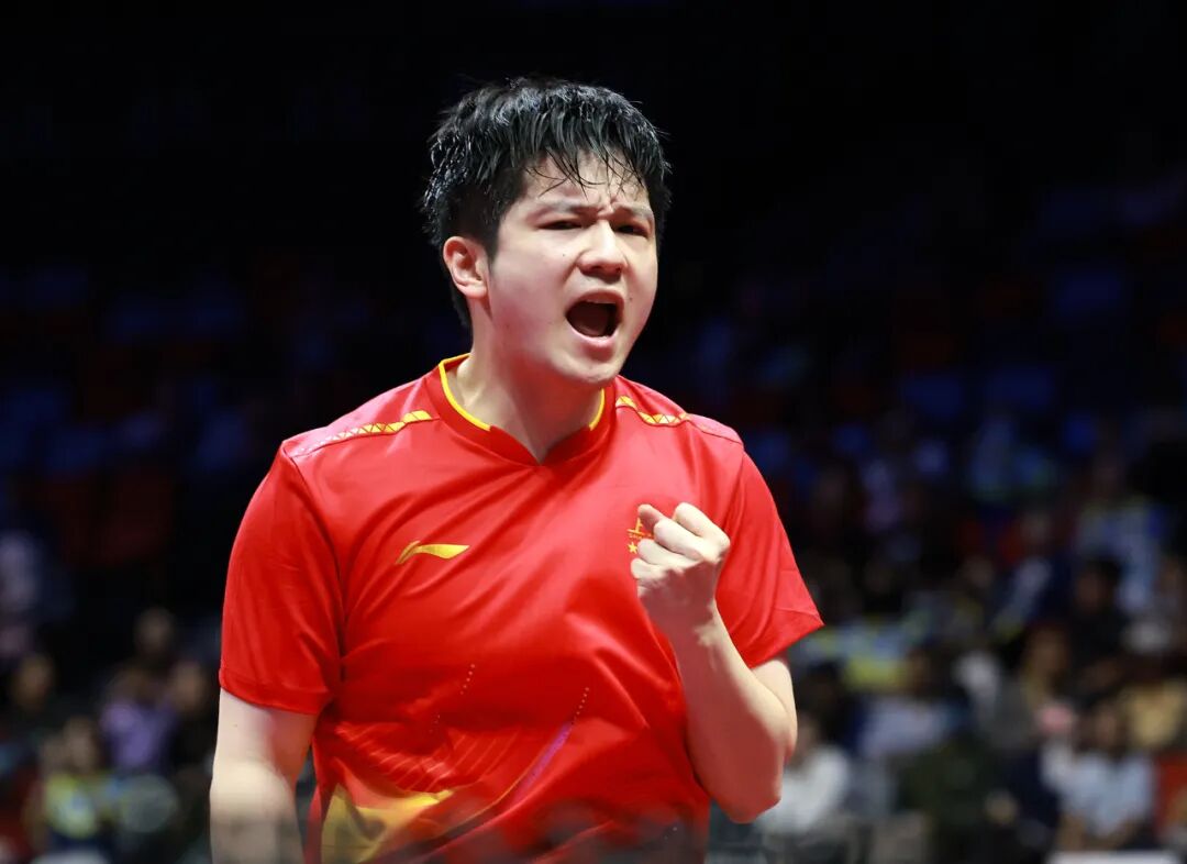11月16日,上海队选手樊振东在比赛中庆祝。新华社记者 梁旭 摄