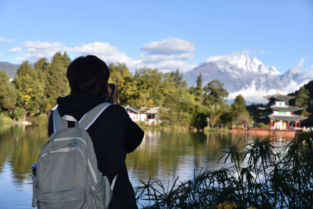 游客在黑龙潭公园拍摄玉龙雪山。(丽江融媒记者 段玉菊 摄)