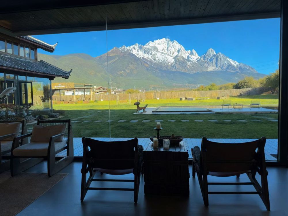 在漫栖湾雪山野奢民宿,一抬眼便能欣赏玉龙雪山美景。(丽江融媒记者 段玉菊 摄)