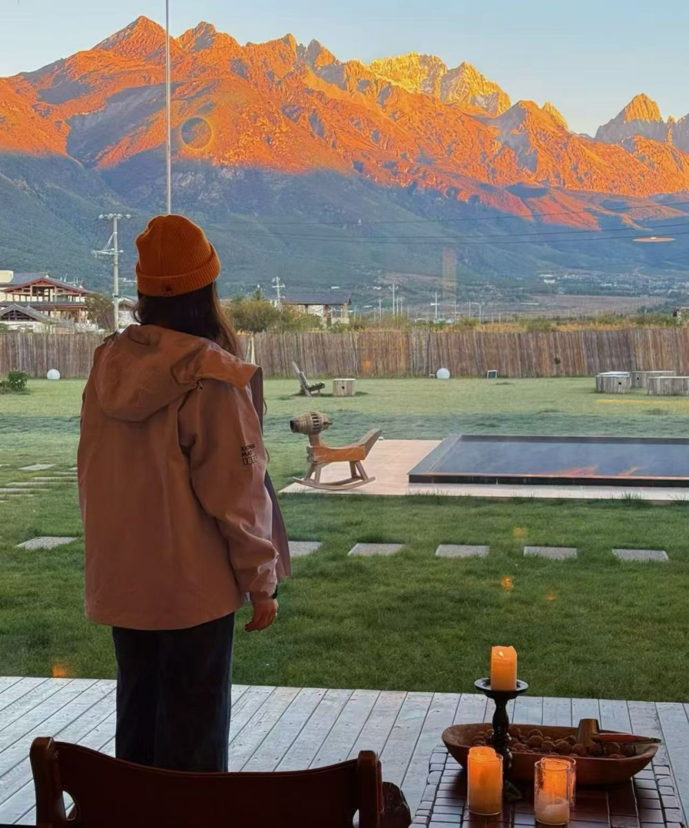 日落时分,位于玉龙县白沙镇新善村的漫栖湾雪山野奢民宿内,聚满了等候“日照金山”的游客。民宿直面雪山,藤椅旁暖炉暖意融融,游客或倚坐远眺或举机静候,目光追随着天际光影。当暮光吻上雪峰,人群中“哇”声一片,快门声此起彼伏,却无人高声,生怕打破这份神圣。杭州游客手机录像,声音带着激动:“坐在庭院里便能邂逅如此美景,仿若被大自然垂青。”这一幕“日照金山”成了旅人心底最动人的诗行。