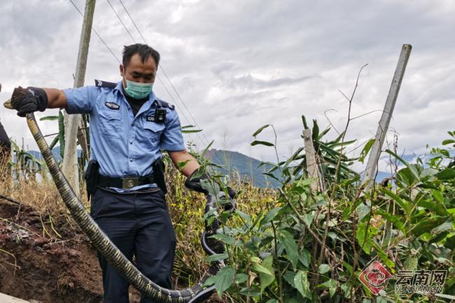 高黎贡山自然保护区森林派出所辖区属热区,每年七八月份,气温持续升高,眼镜王蛇、眼镜蛇等毒蛇活动频繁,常常惊扰群众,所里时常会接到救助野生动物的电话。作为所里的“老江湖”,“老K”可以说是与野生动物打交道最多的工作人员之一,守山护林15年的经历,练就了他一身眼疾手快的捕蛇本领。每当接到救助蛇的警情,“老K”就成为了处警的“定心丸”。
