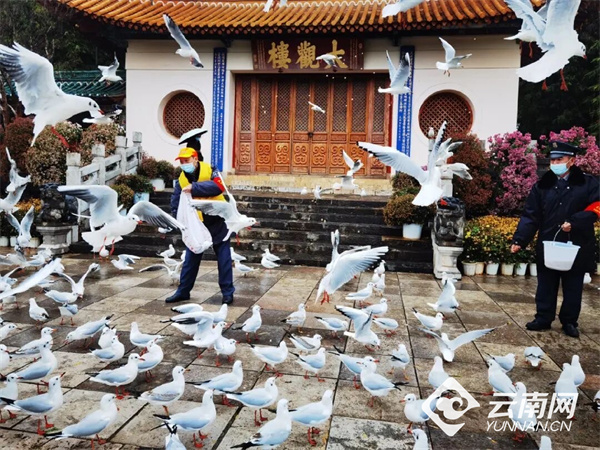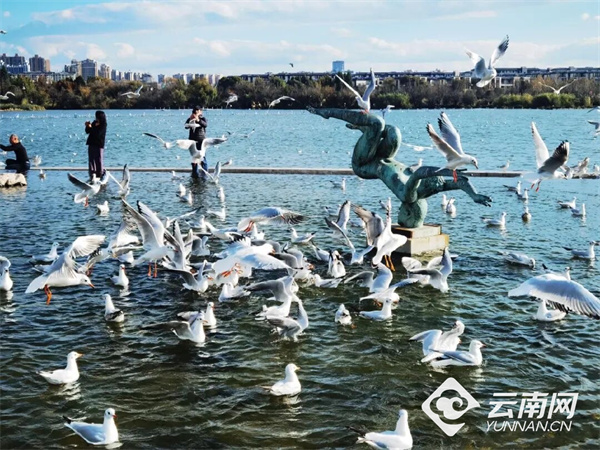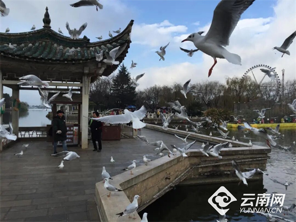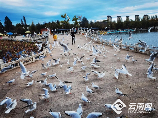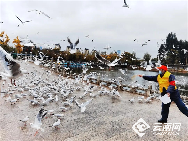 这份守护离不开公园100多位工作人员的付出。观鸥季期间,每天除了5-6名专职志愿者穿红马甲巡逻,公园的行政人员、党员、安保、绿化、保洁人员等全员都化身护鸥志愿者,会引导市民游客文明观鸥、安全投喂。每年,大观公园还会围绕观鸥季,开展海鸥主题讲座、盆景展示、摄影展览、研学活动等活动。“我们希望通过这些活动,不仅守护好红嘴鸥,更能让市民游客在亲近自然的同时,感受昆明‘生物多样性城市’的魅力,实现社会效益、文化效益、经济效益与品牌效益的统一。”