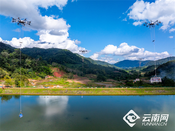 施工现场,30多架无人机与2架直升机组成高低搭配的编队,在雨林上空架起一条“绿色通道”。通过多机互补作业,从几公斤工器具到900公斤超重塔材,均可实现稳定精准运输。工程还创新采用“四机联吊”技术,破解了250至600公斤级大型塔材的运输难题。