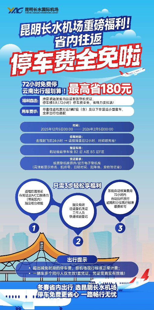 云南的朋友们注意啦!昆明长水国际机场送上冬春出行重磅福利——持昆明始发省内往返登机凭证,可享72小时免费停车,省钱力度直接拉满!