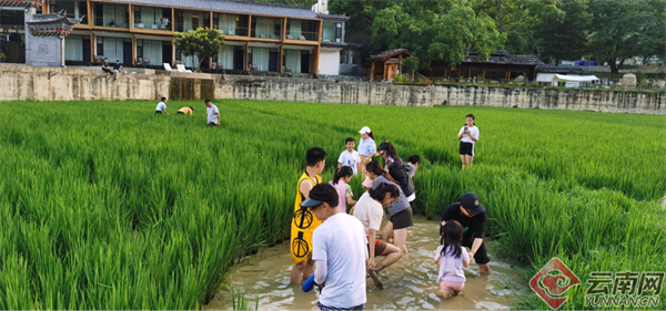 亲子游客在启别村稻田间体验摸鱼。受访者 供图