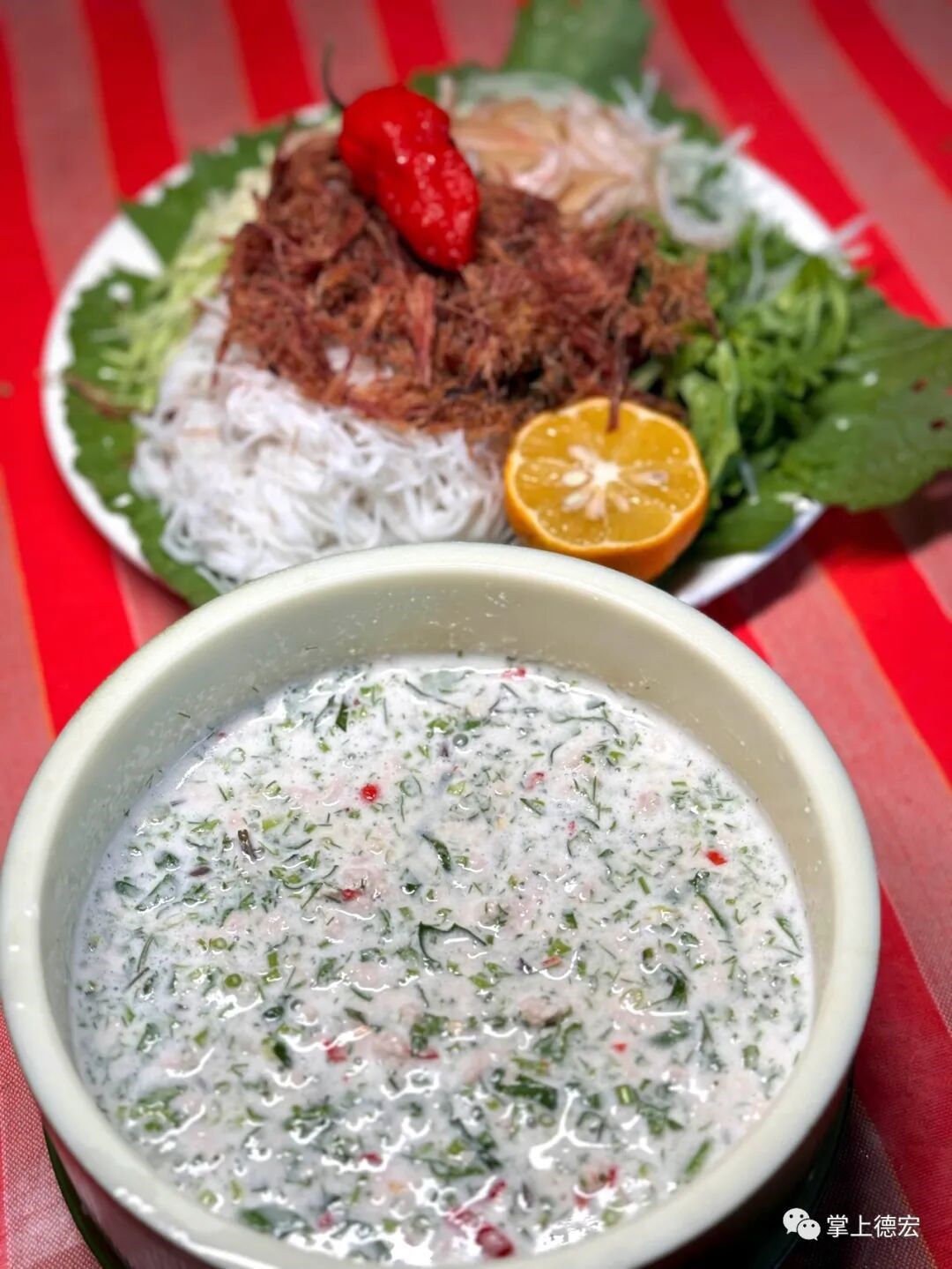 最惊艳的当数正宗傣味坚果撒,坚果的清香与撒苤的酸爽完美契合,芫荽、茴香的清新,小米椒的辛辣,酸黄果的酸甜,共同勾勒出独特的风味。夹一撮米线,拌上烤肉与鲜蔬,在蘸料中轻轻一滚,清爽与香浓在口中交织,那酸辣醇香的刺激,正是德昂山上独有的烟火浪漫。