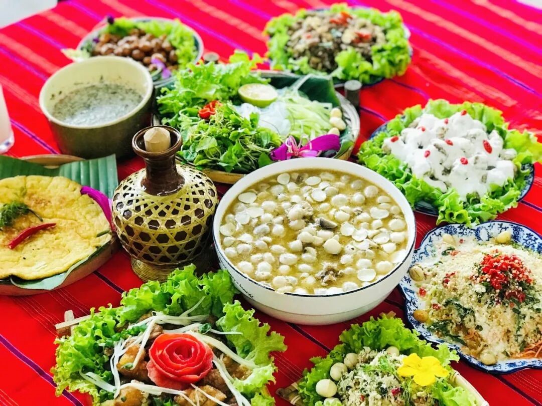 桌上外焦里嫩的坚果蜂蜜缘是餐桌上的甜蜜担当,咬开酥脆外皮,果仁的焦香与蜂蜜的甜润在口中化开;浓醇不腻的坚果汁暖胃暖心,坚果舂撇菜根清爽解腻,还有浓香细腻的坚果圆子,每一口都藏着盈江的烟火气。