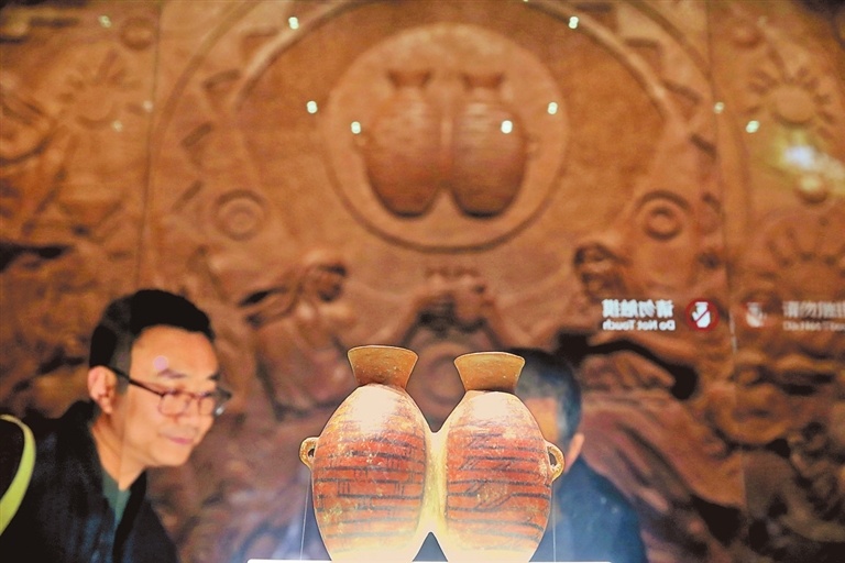 观众在大河村遗址博物馆新馆参观彩陶双连壶展品。