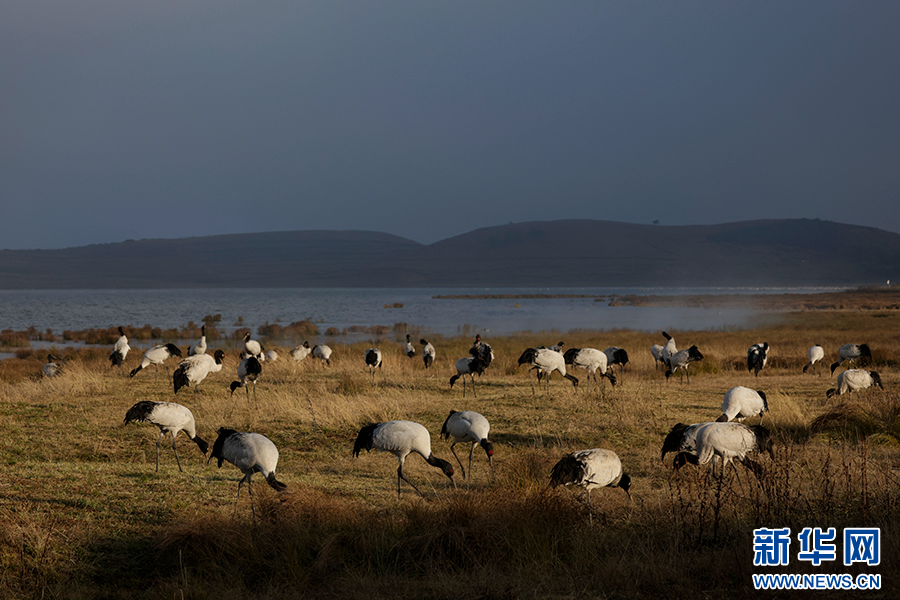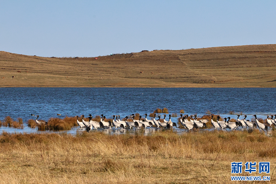 在保护区内自由活动的黑颈鹤(11月27日摄)。新华网发(余汝毅 摄)