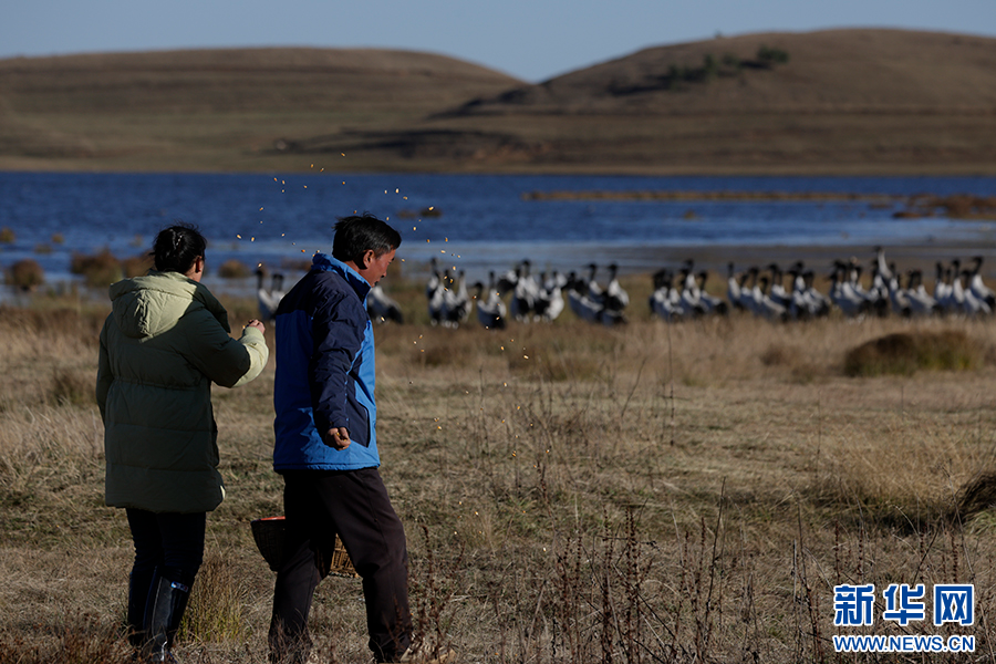 邵聪学和妻子冯碧艳在给黑颈鹤投喂玉米(11月27日摄)。新华网发(徐华陵 摄)