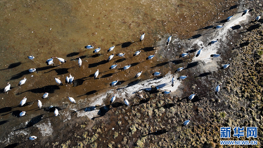 航拍下的黑颈鹤(11月27日摄)。新华网发(徐华陵 摄)