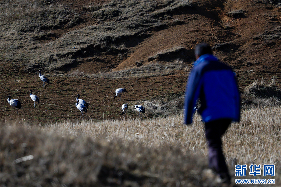 邵聪学在远处观察黑颈鹤采食地里的洋芋(11月27日摄)。新华网发(徐华陵 摄)