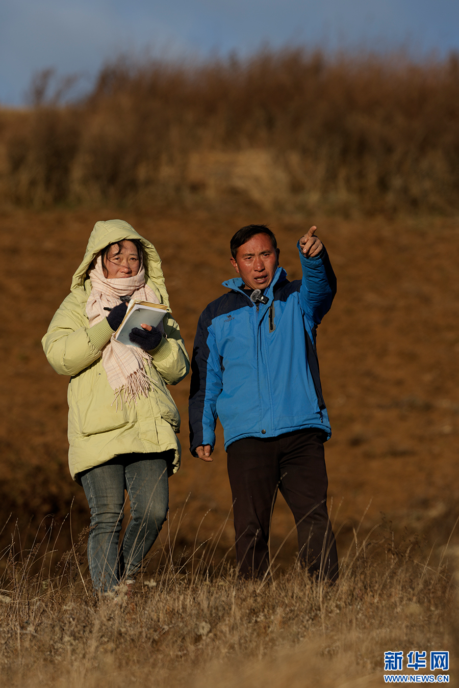 清晨,邵聪学和冯碧艳清点黑颈鹤数量,观察其活动情况(11月27日摄)。新华网发(徐华陵 摄)