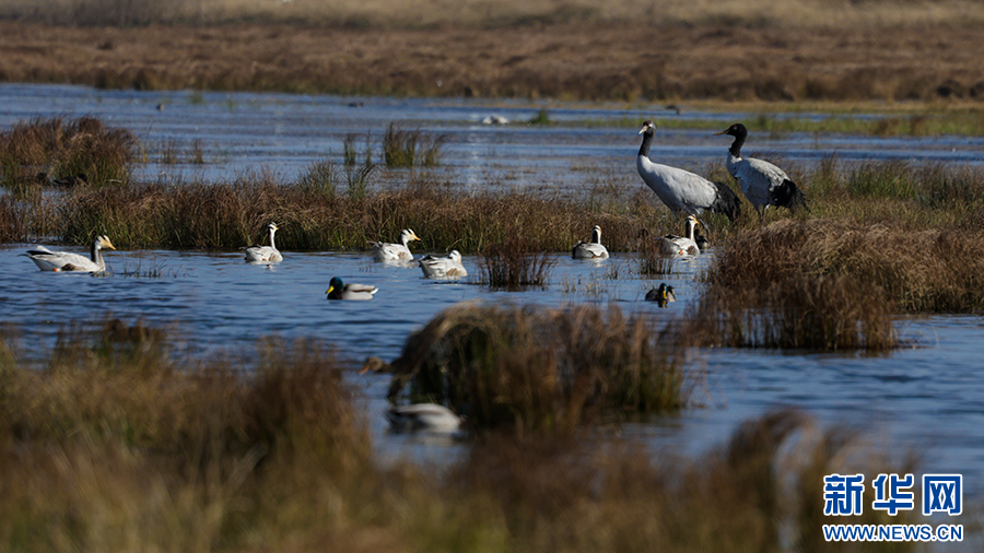 黑颈鹤和其他水鸟和谐共处(11月26日摄)。新华网发(徐华陵 摄)