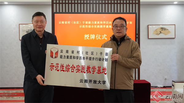 签约仪式上,云南开放大学校长于干千为全省“双提升”项目示范性综合实践教学基地授牌,建水县委书记赵雄代表建水县接基地牌。双方就推动项目落地进行了进一步磋商。