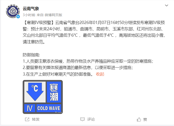 预计未来24小时,昭通市、曲靖市、昆明市、玉溪市东部、红河州东北部、文山州北部日平均气温低于6℃ ,最低气温低于4℃ ,高海拔地区还将出现小雪,请注意防范。