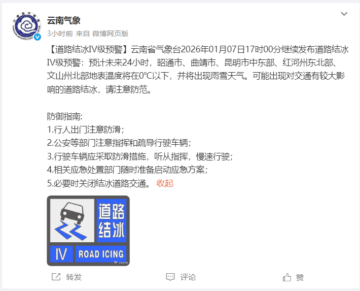 预计未来24小时,昭通市、曲靖市、昆明市中东部、红河州东北部、文山州北部地表温度将在0℃以下,并将出现雨雪天气。可能出现对交通有较大影响的道路结冰,请注意防范。