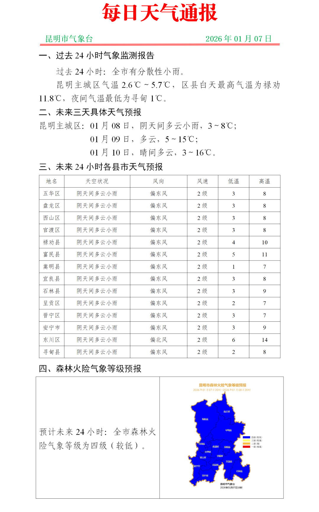 1月7日20时到1月8日20时:昭通市南部、曲靖市东部阴有小雪或雨夹雪,曲靖市西部、昆明市、玉溪市、文山州北部、红河州北部、普洱市、西双版纳州、临沧市、楚雄州南部阴天间多云局部有小雨,其他地区多云间晴。