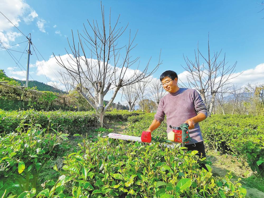 茶农修剪茶树。