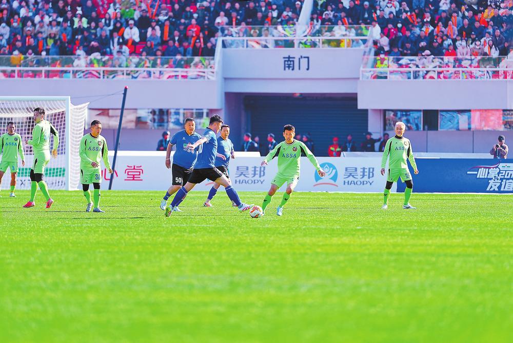 1月10日,2026滇港足球友谊赛在昆明体育场举行,香港明星足球队和昆明明星足球队同场竞技,吸引了近万名观众到场观看。
