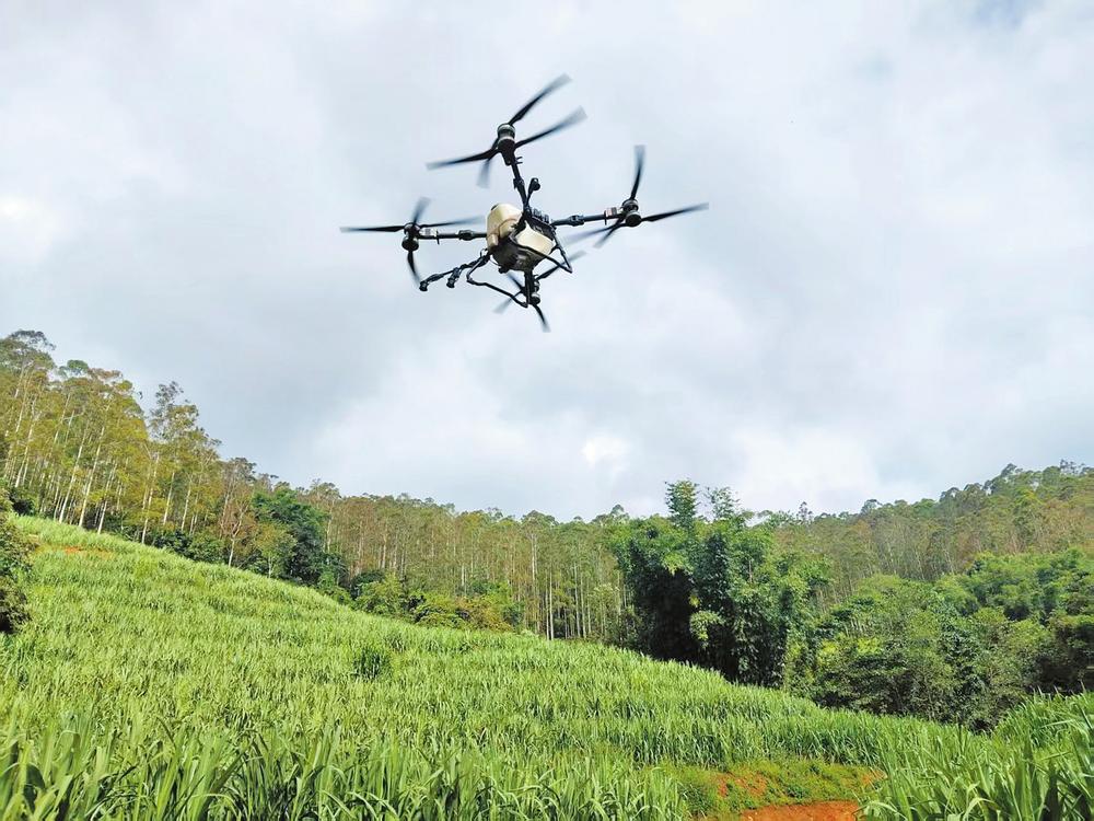 无人机在甘蔗园喷洒农药。通讯员 岩江 摄