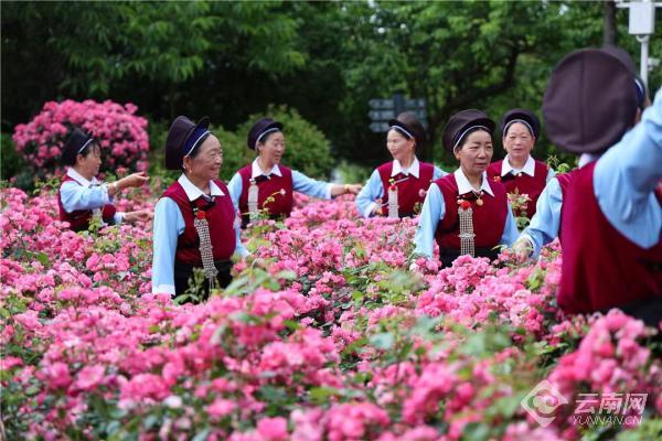 图说:穿着白族服饰的老人们正在赏花 通讯员 杨淑香 摄