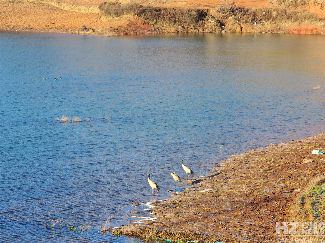 会泽驾车华山松省级自然保护区水塘片区,因长期积水形成典型湿地生境。随着冬季迁徙季来临,这片生态优良的水域吸引了被誉为 “高原精灵” 的黑颈鹤前来栖息。在浅滩之上,几只黑颈鹤时而踱步悠闲觅食,时而迎风展翅翩跹嬉戏,灵动的身影与澄澈水面、苍茫草甸相映成趣,勾勒出一幅人与自然和谐共生的美好画卷。