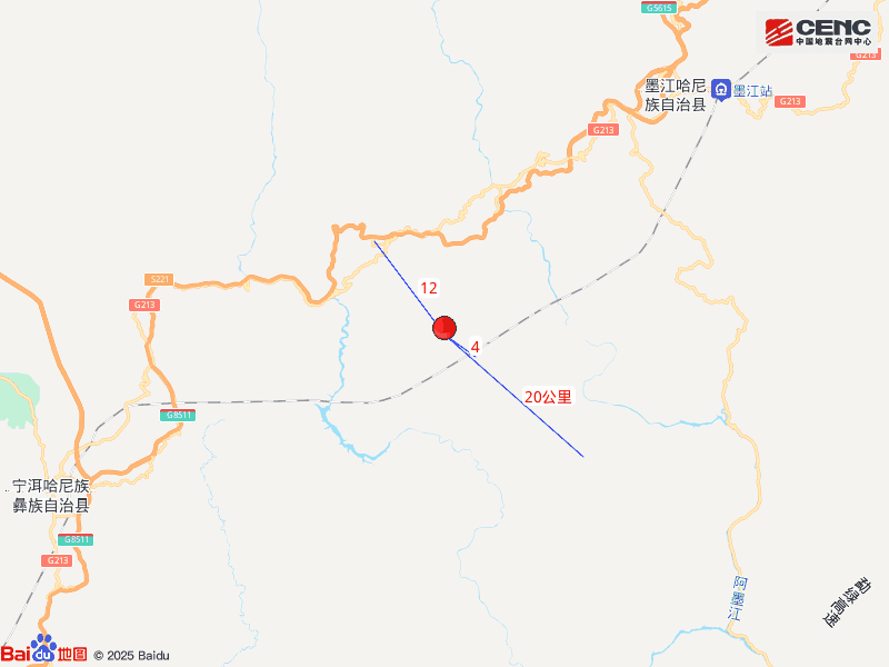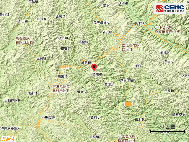 周边县城:震中距墨江哈尼族自治县34公里、距宁洱哈尼族彝族自治县46公里、距思茅区68公里、距元江哈尼族彝族傣族自治县70公里、距江城哈尼族彝族自治县81公里,距普洱市66公里,距昆明市241公里。