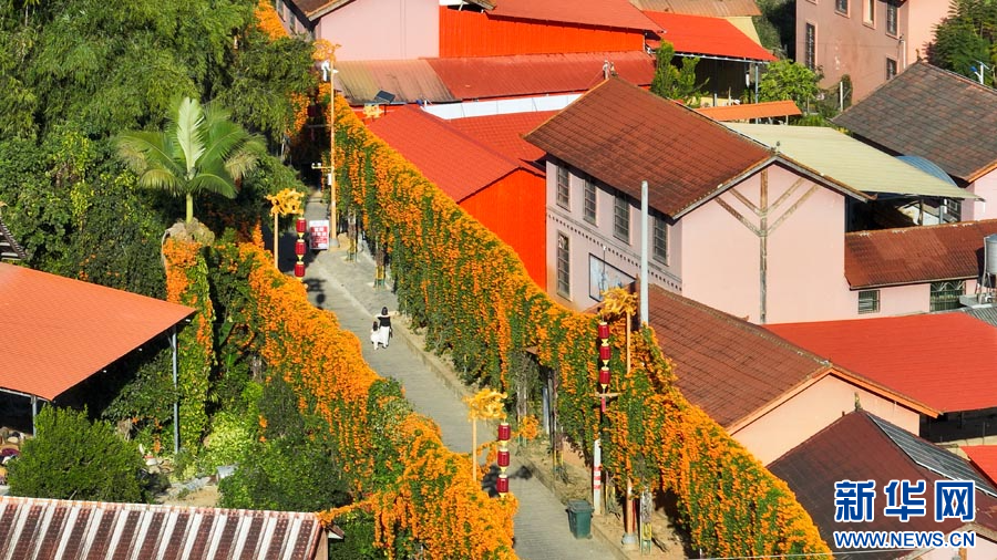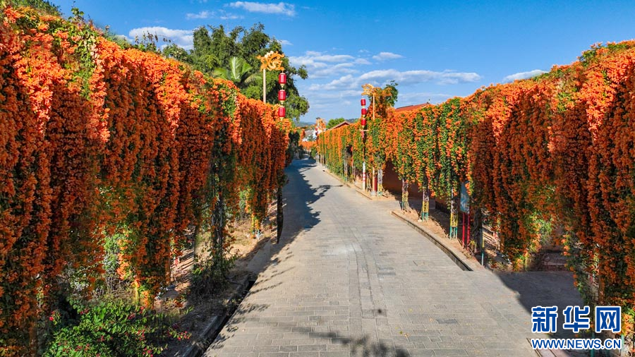 近日,在云南省陇川县龙安村,炮仗花沿着上百米的道路灿烂绽放,宛如两条橙红瀑布倾泻而下。微风吹过,花枝轻摇,橙红的花浪随风涌动,在阳光下显得生机勃勃。(段宗智 方雯青)