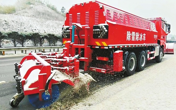 1月20日,南益高速草尾收费站段,长沙消防救援机动支队派出的大型专业设备在清扫路面积雪。廖飞翔 卜宇程 摄影报道(湖南图片库)