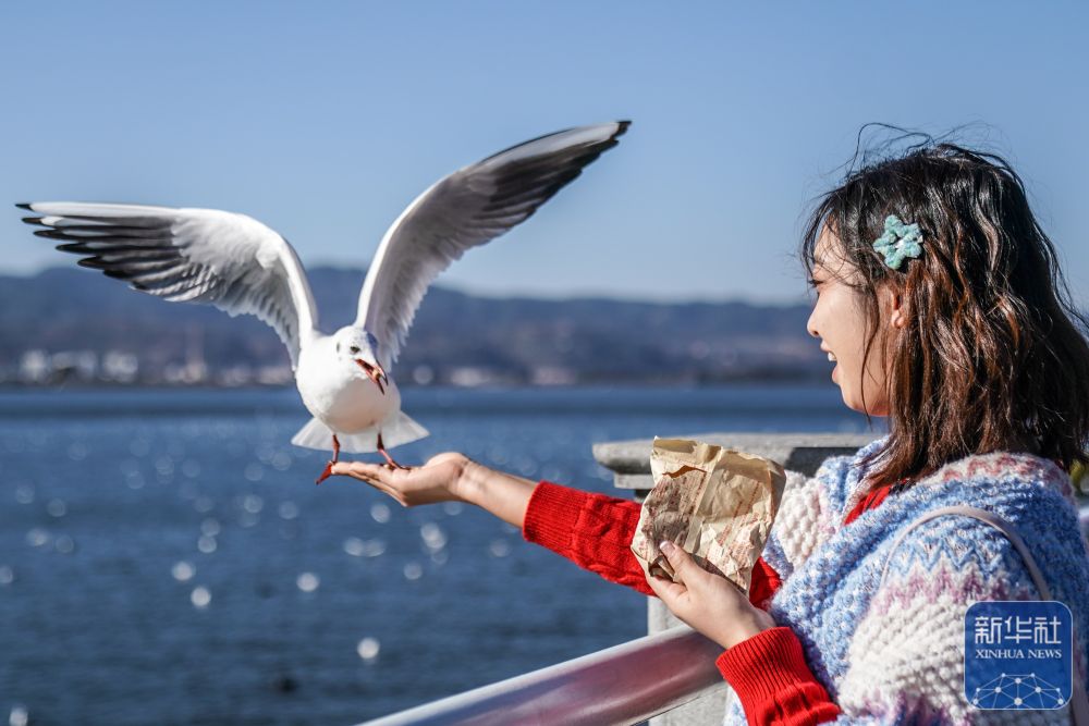 ↑ 1月22日,游客在滇池畔喂红嘴鸥。