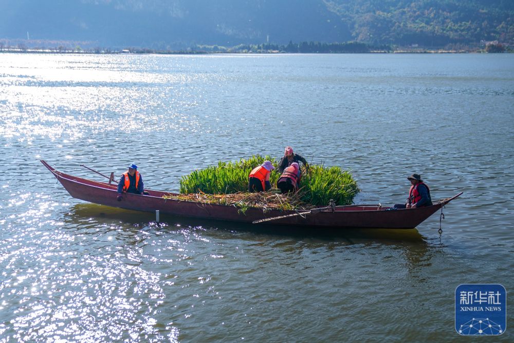 ↑ 1月22日,工作人员对滇池里的生态浮岛进行植物管护。