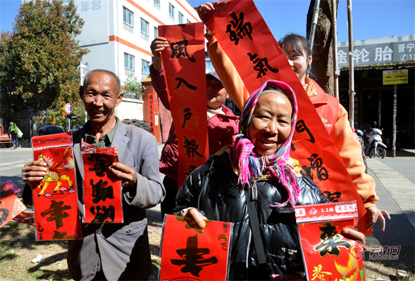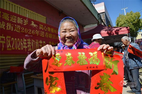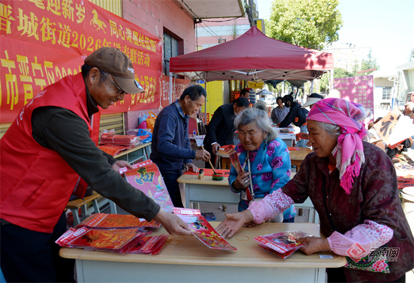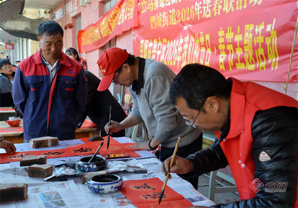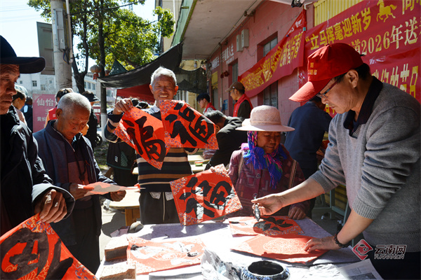 为喜迎新春,昆明市晋宁区围绕2026年“我们节日·春节”主题活动,组织开展2026年贺新春送春联暨“翰墨飘香 福送万家”迎新春义写春联活动,文化服务志愿团队在晋城镇、昆阳镇、夕阳彝族乡等乡镇,为基层乡村和社区群众现场书写春联喜福,送上喜迎新春的美好祝福。春节临近,形式多样的文化下乡服务活动在昆明市各区县开展,落实文化惠民措施,把优质公共文化服务送到基层,在弘扬优秀传统文化中营造喜庆祥和的节日氛围。