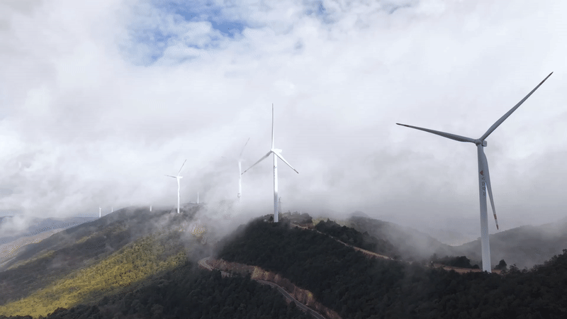 在云南省楚雄彝族自治州姚安县海拔2700米的保顶山,一座风电场静静矗立在云雾之中。