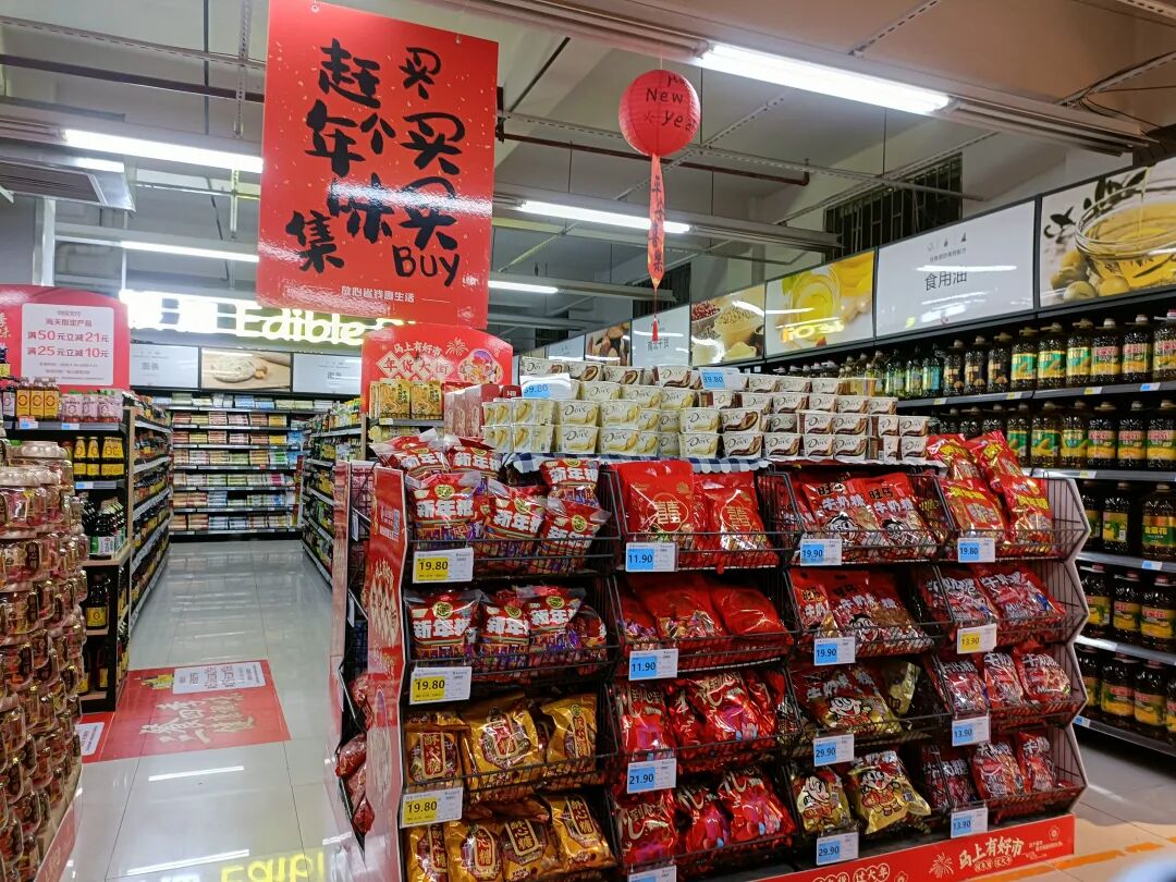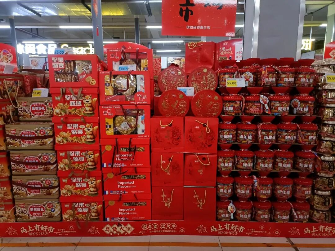 超市各色酒水糖果一应俱全、各类商品琳琅满目,货架上码满了喜庆的新年款,年货区礼品整齐陈列,形如小山,以一抹鲜艳的“中国红”为主色调,背景音乐播放着喜庆欢快的曲调,衬着灯光下选购年货的人们,描摹出一幅热闹而温馨的节日图景。