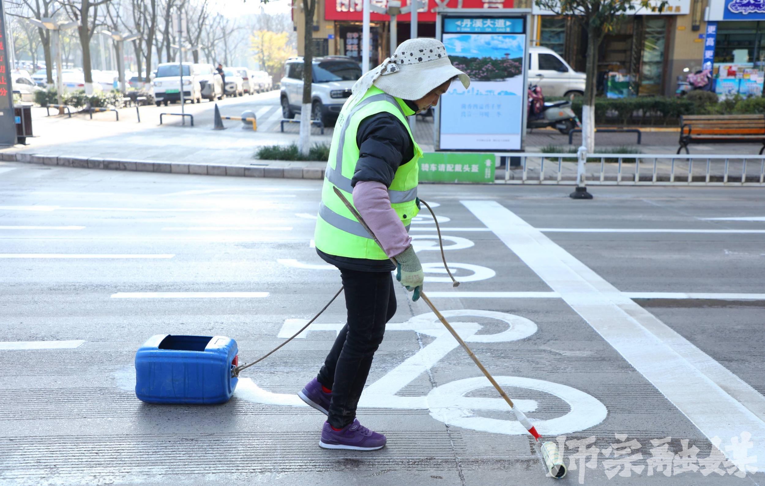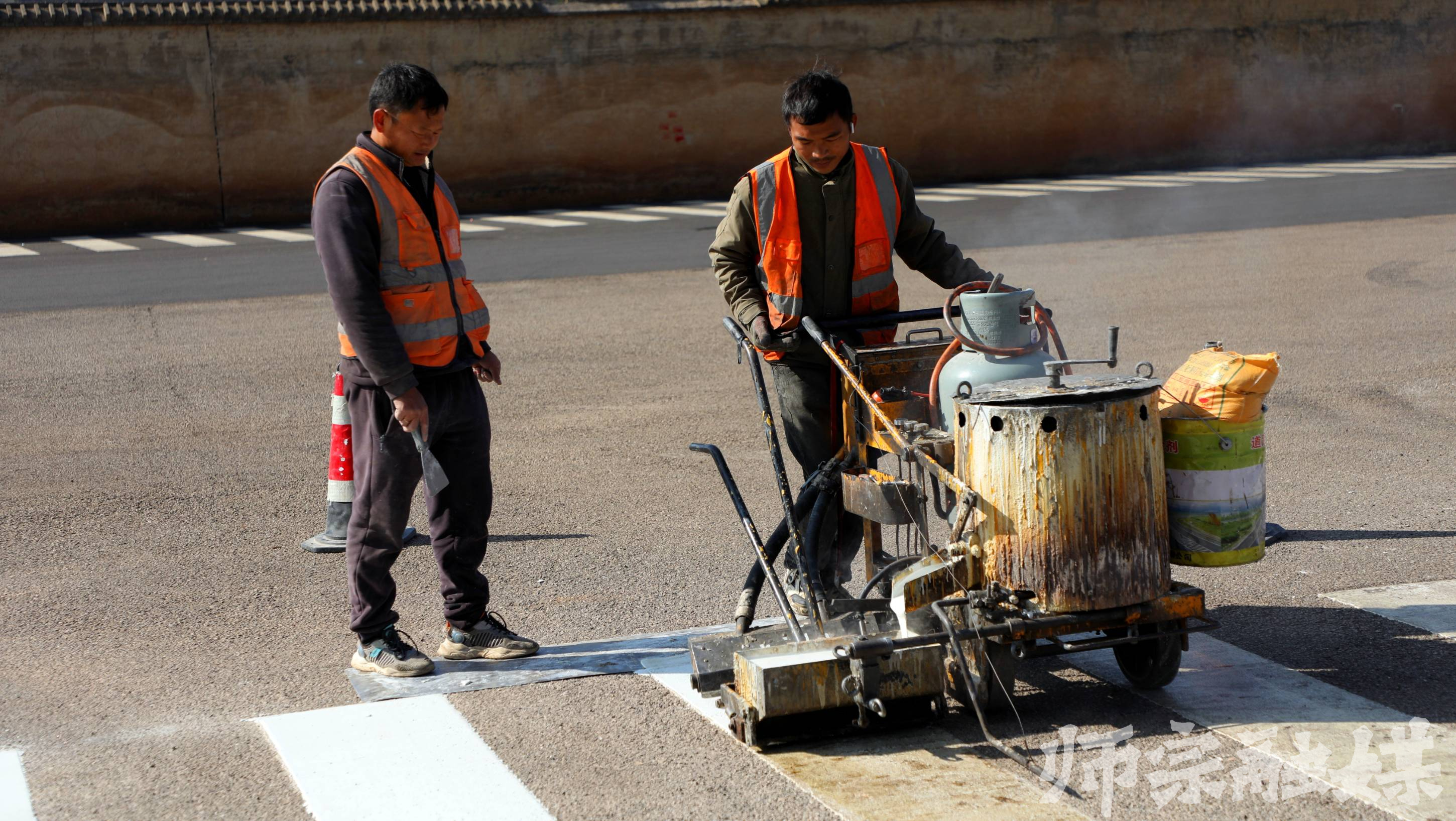 与此同时,在通源大街中段,记者看到,施工人员正在有序忙碌着,有的刷胶,有的正在操作热熔划线机,沿着刷胶条施划崭新的交通标线。随着热熔划线机缓缓前行,明亮的白色边线、清晰的斑马线以及醒目的导向箭头逐一呈现,让道路的面貌焕然一新。