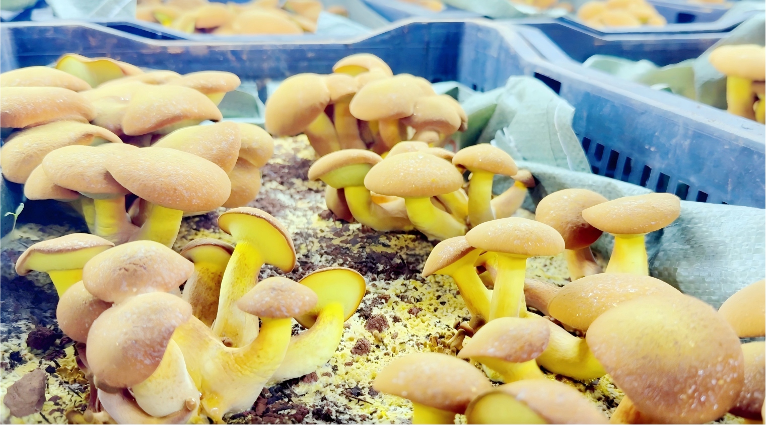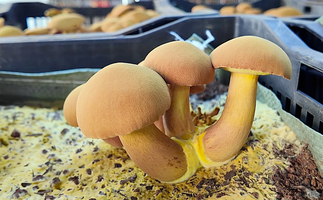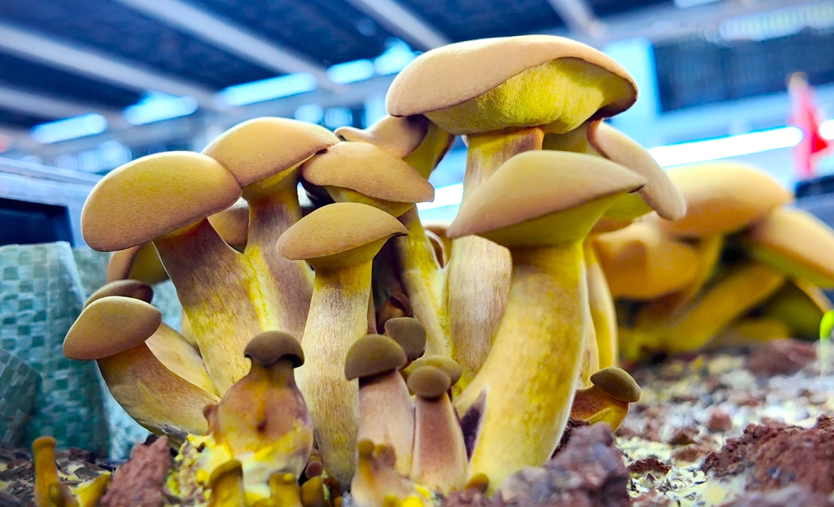 在富源县墨红镇法土林场的云南林菌农业科技有限公司,一排排整齐的智慧方舱里,藏着冬日里的专属菌鲜。一簇簇黄牛肝(见手青)长势喜人,菌盖圆润饱满、菌柄粗壮挺拔、色泽金黄鲜亮,轻轻一碰菌肉,就会呈现标志性的青蓝色,和野生见手青几乎一模一样。