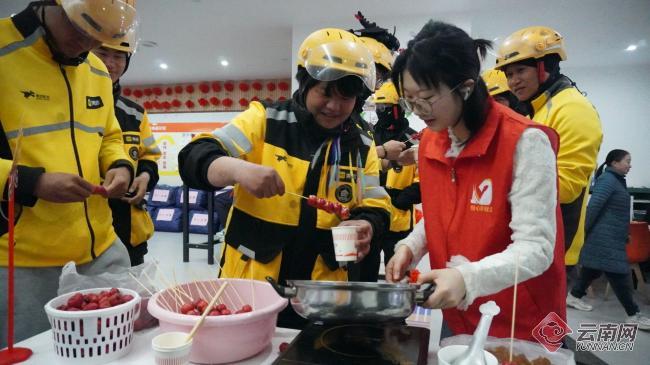 这里是昆明市怡心桥社区,为了与外卖骑手们一起共同迎接春节,社区工作人员精心布置场地,红彤彤的春联福字挂满墙面,中国结与红灯笼相得益彰,驿站内充满浓浓的节日氛围。活动现场,骑手们围坐在一起剪窗花、做糖葫芦,红纸在指尖变成寓意吉祥的喜鹊、福字图案,酸甜可口的糖葫芦串起团圆的期盼。