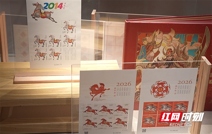 尤为值得关注的是,展览落地株洲博物馆时特别增设专属独立单元“驰跃邮韵”。该单元以方寸邮票为载体,集中展出四轮生肖马年邮票实物,以纸间天地映照千年马韵。从首轮生肖马的质朴设计,到近年邮票的现代语汇,邮品如同时代的切片,将不同时期的审美风潮与民族情感凝于方寸之间。与此同时,株洲博物馆精选多件馆藏马主题珍贵文物融入展览,题材涵盖历史事件、吉祥纹饰与水墨艺术,巧妙实现本土文化记忆与中华马韵传承的双向奔赴。