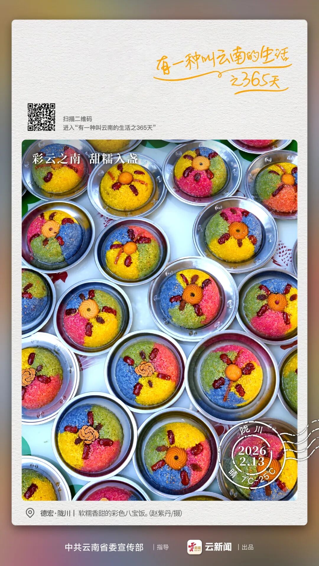 腊月的德宏傣族景颇族自治州陇川县,晨雾未散,灶上已腾起袅袅白烟,一锅彩色八宝饭正冒着香气,盖子揭开,白雾涌出,一整盘彩虹从碗底倒扣着升起。