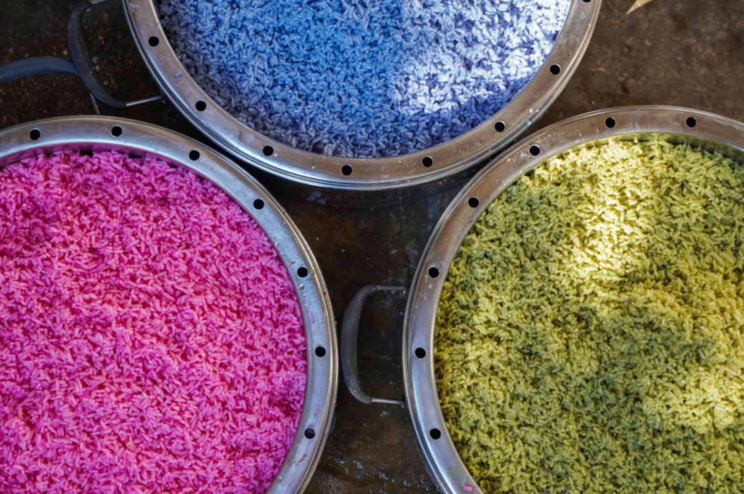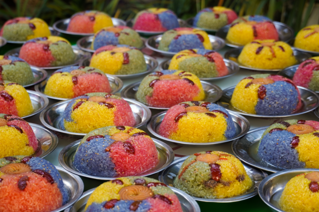 做八宝饭,是一场对自然的致敬。不用一滴人工色素,只取果蔬本真的颜色,染饭花的暖黄、蝶豆花的湛蓝、娘惹花的鲜绿、火龙果的玫红,这些自然馈赠的色彩,将糯米浸出满碗斑斓。铺果脯、填豆沙,层层码放的是团圆期许,倒扣出碗——“嘭”一声,彩虹悬盘,山河在案。