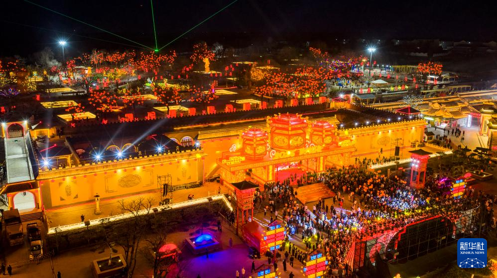 2月10日,河南省三门峡市陕州地坑院灯会展区游人如织(无人机照片)。