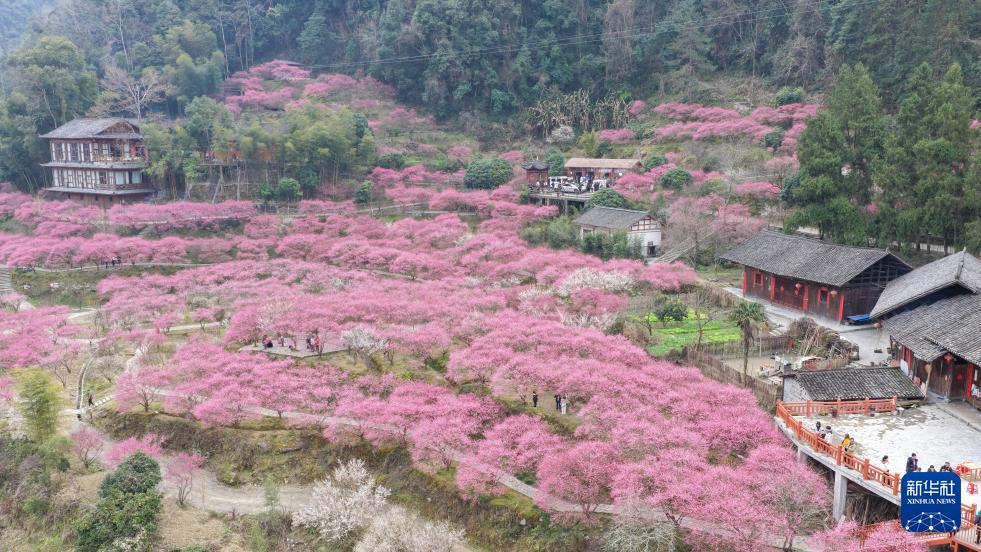 2月12日,游客在湖南省湘西土家族苗族自治州永顺县灵溪镇土家竹梅山寨陈家坡赏梅(无人机照片)。