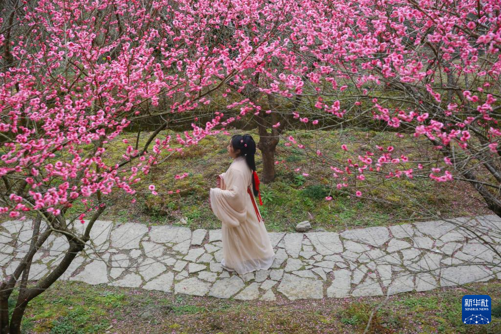 2月12日,游客在湖南省湘西土家族苗族自治州永顺县灵溪镇土家竹梅山寨陈家坡赏梅。