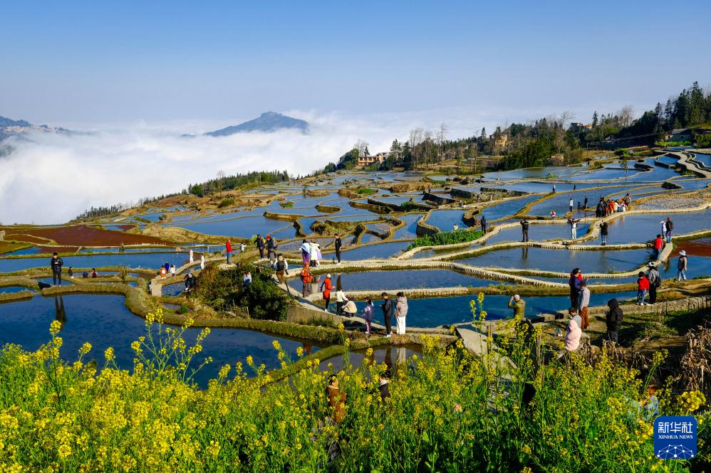 2月12日,游客在云南省元阳县新街镇爱春梯田景区游览。