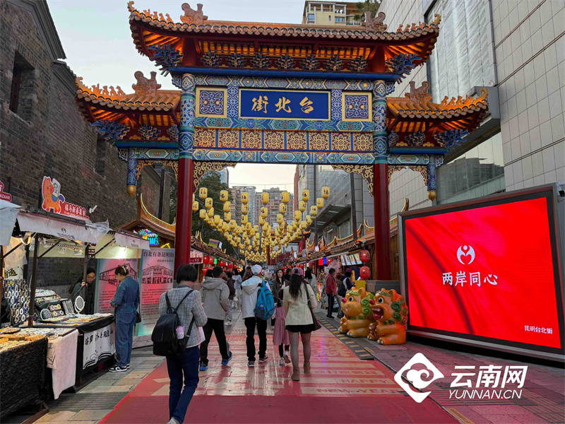 作为昆明市五华区打造的对台交流特色示范街区,昆明台北街自2025年4月正式运营以来,始终秉持“两岸一家亲”理念,汇聚多家台湾商户和创业青年,逐步形成集文化展示、情感联结、经贸合作于一体的综合性交流平台。节庆期间客流持续走高,已成为市民游客喜爱的夜间打卡地标。