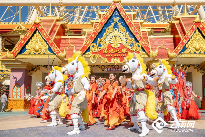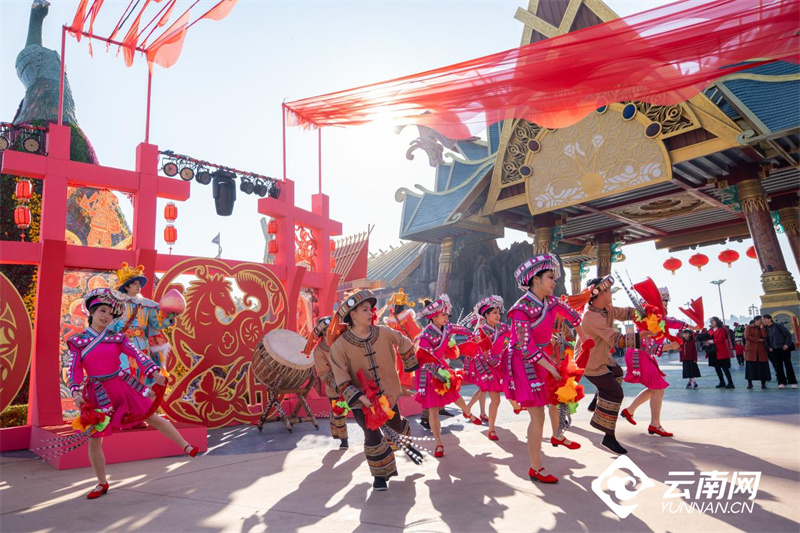 当鼓声敲响新春的序曲,当醒狮衔来新年的祝福,当幻彩烟花点亮团圆的夜空……一场有声有色的新春盛宴在七彩云南古滇度假区热闹上演。活动以“骐骥贺岁•年在古滇——2026新春奇妙会”为主题,将民族风情融于传统年味中,以“巡游、庙会、新春演艺”为核心内容,为五湖四海的游客朋友呈现视听交融的文化盛宴。