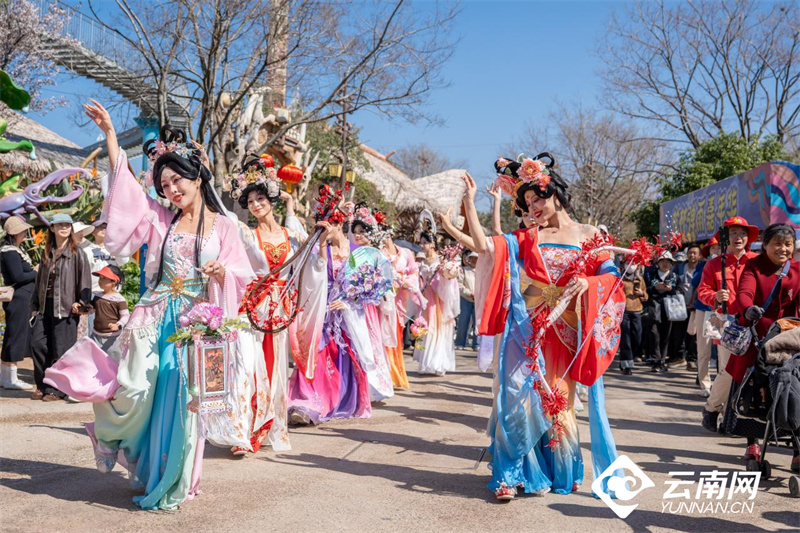 位于摩天轮下的《萌马闹新春》,以卡通化、拟人化的“萌马”形象为主角,搭配儿童歌舞等轻松活泼的表演形式,让孩子们在欢声笑语中感受春节的快乐。萌马们或跳跃、或撒娇、或搞怪,吸引了大小朋友的注意,纷纷上前与之互动。园区洪荒秘境广场处的《花神迎春》,则是一场唯美浪漫的视觉盛宴。十二位身着汉服的“花神”依时令次第登场,手持象征春意的花卉,伴随琵琶、笛箫等乐器,缓步巡游。她们轻舞飞扬,传递“花开富贵、春满人间”的美好祝愿,为新春增添一抹诗意与雅致。