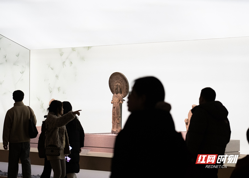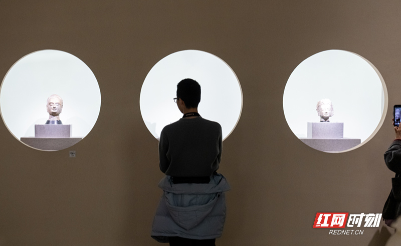 观众在佛像文物前驻足观赏,有的指点交流,有的拍照记录,在热闹而有序的氛围中感受浓浓文化。