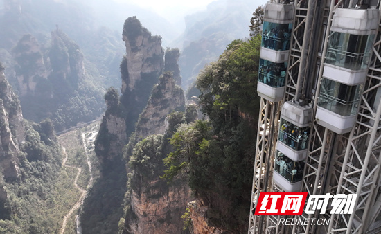 2026年2月22日,游客乘百龙天梯在张家界国家森林公园袁家界景区游览。(吴勇兵 摄)